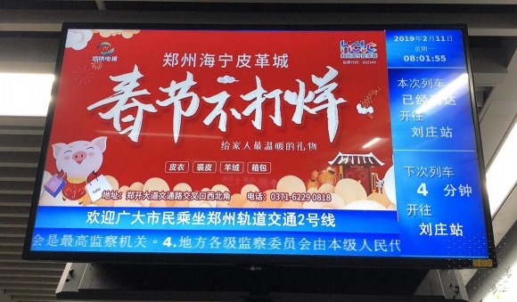 所在地区河南省>郑州市>郑东新区 媒体地址郑州地铁1.2.5号线候车站台55寸